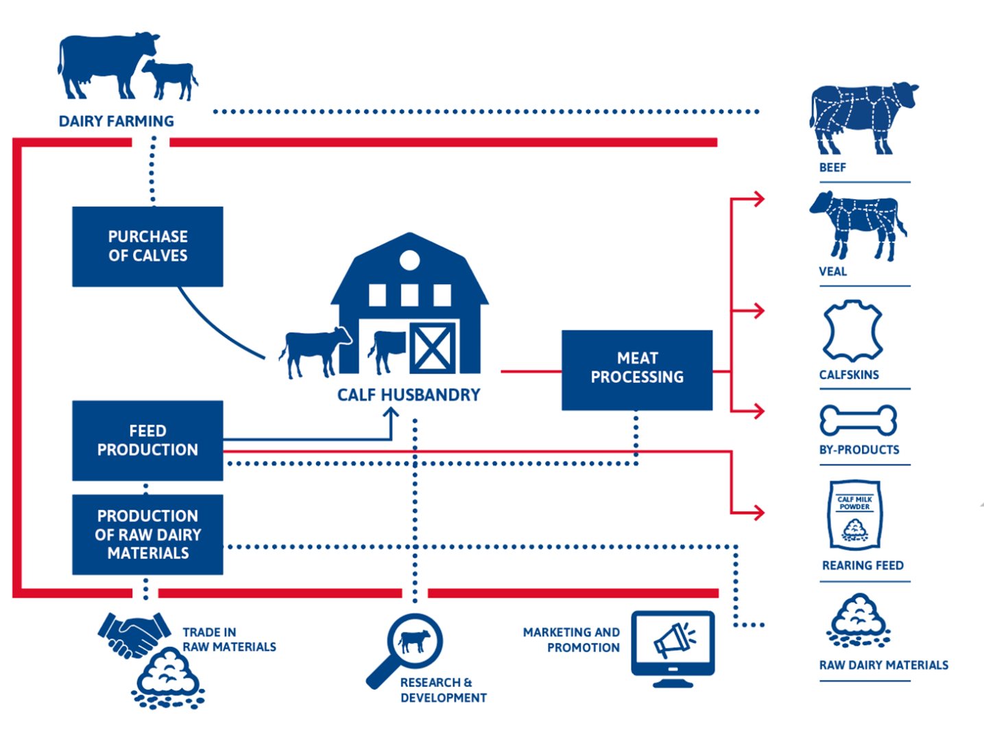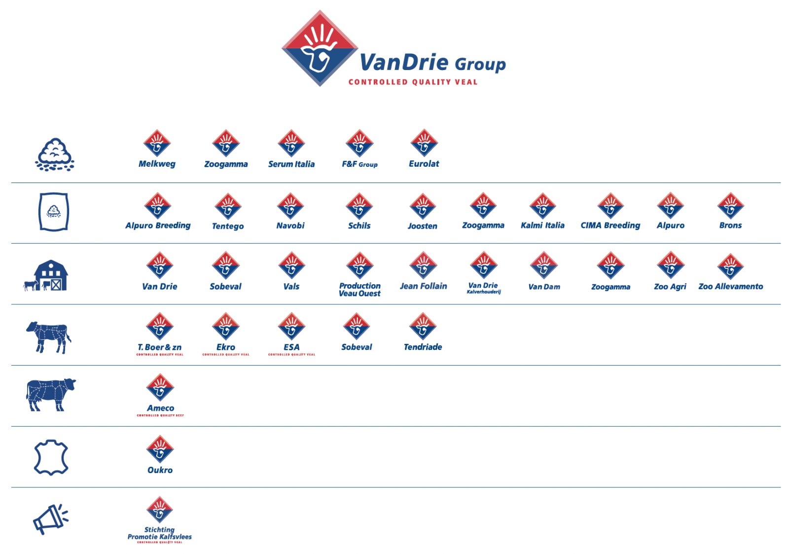 Raising calves is now no longer the VanDrie Group's only activity. Today, the organisation is characterised by chain integration. The VanDrie Group has control over all the links of the production. The companies in the Netherlands, Belgium, France, Italy and Germany produce veal and beef, animal feed, dairy raw materials and calfskins. Other key activities include marketing dairy products for feed and food applications and advising dairy farmers on rearing their calves.